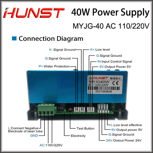 Hunst 40W CO2 Laser Power Supply 110V/220V for 30W 40W 50W Engraving Cutting Machine MYJG-40W Laser Generato